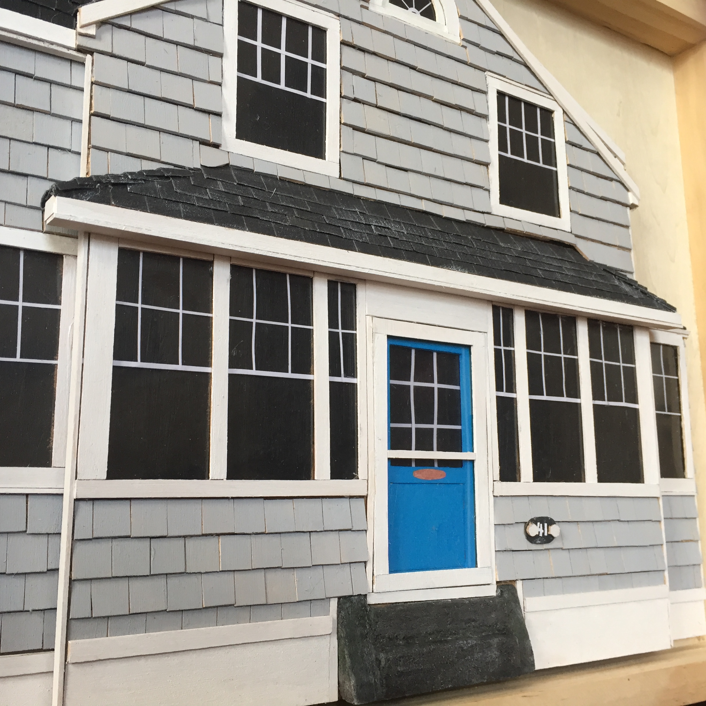 Finally, the details are added to really make it pop: roofing, foundation, cloth window shades, mailbox, gutters, and intricate wooden handrails.