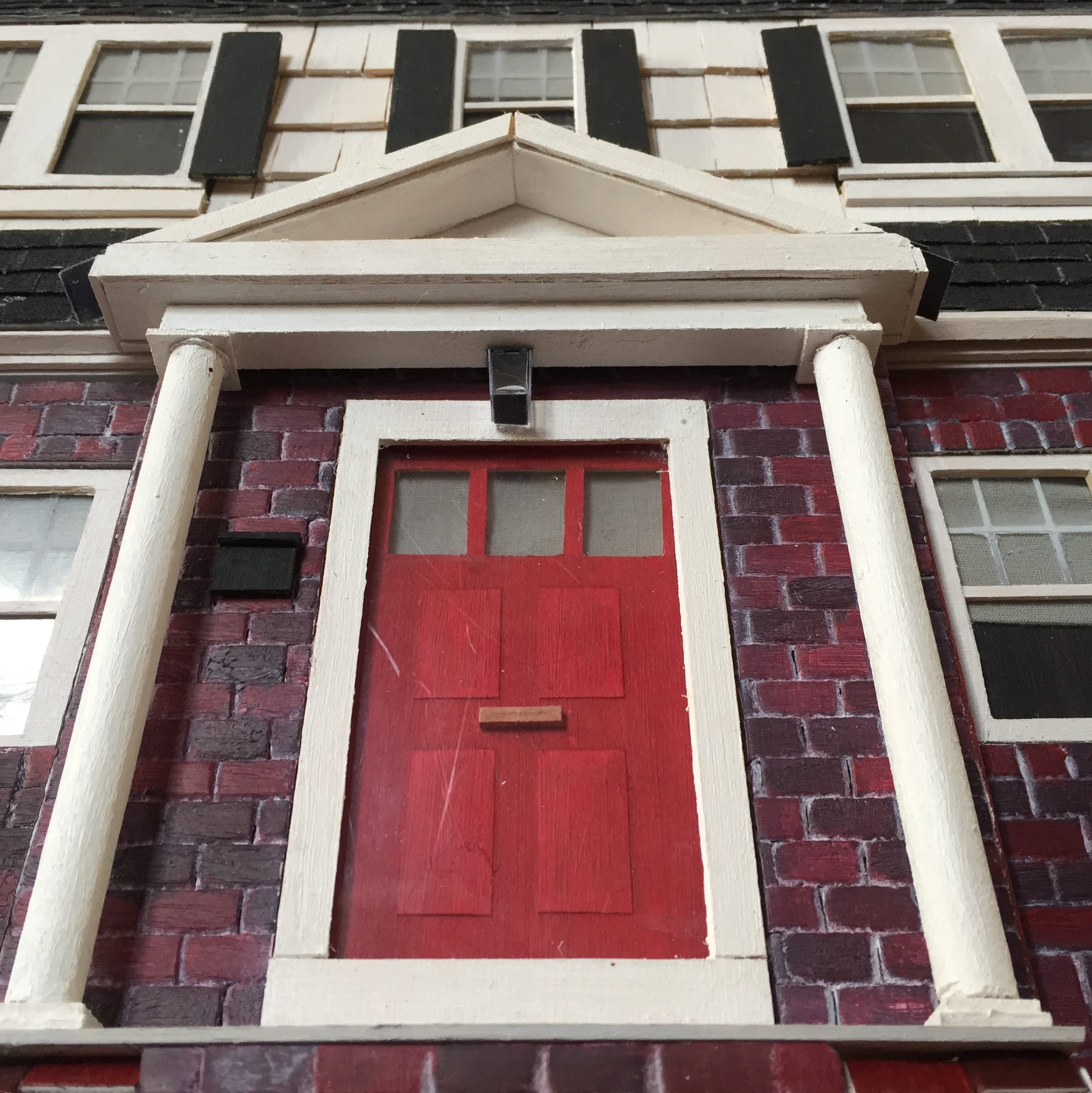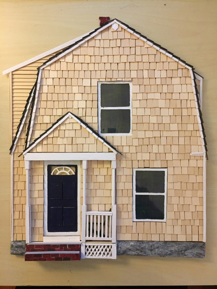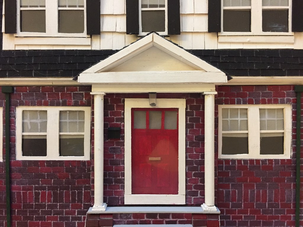 Every component is cut and glued individually: windows, doorframe, front steps. Then it’s wood shingles, vinyl siding, and brick.