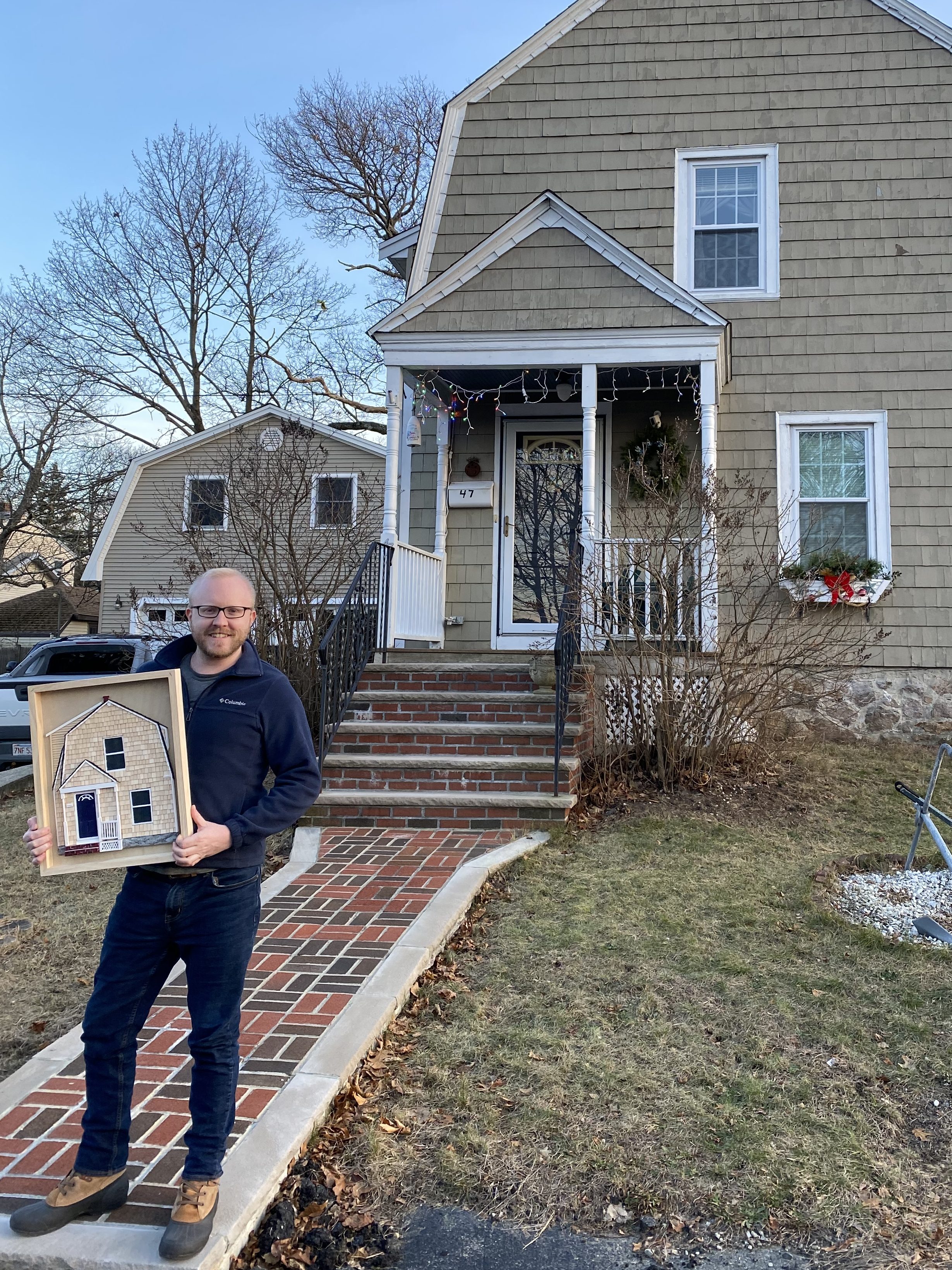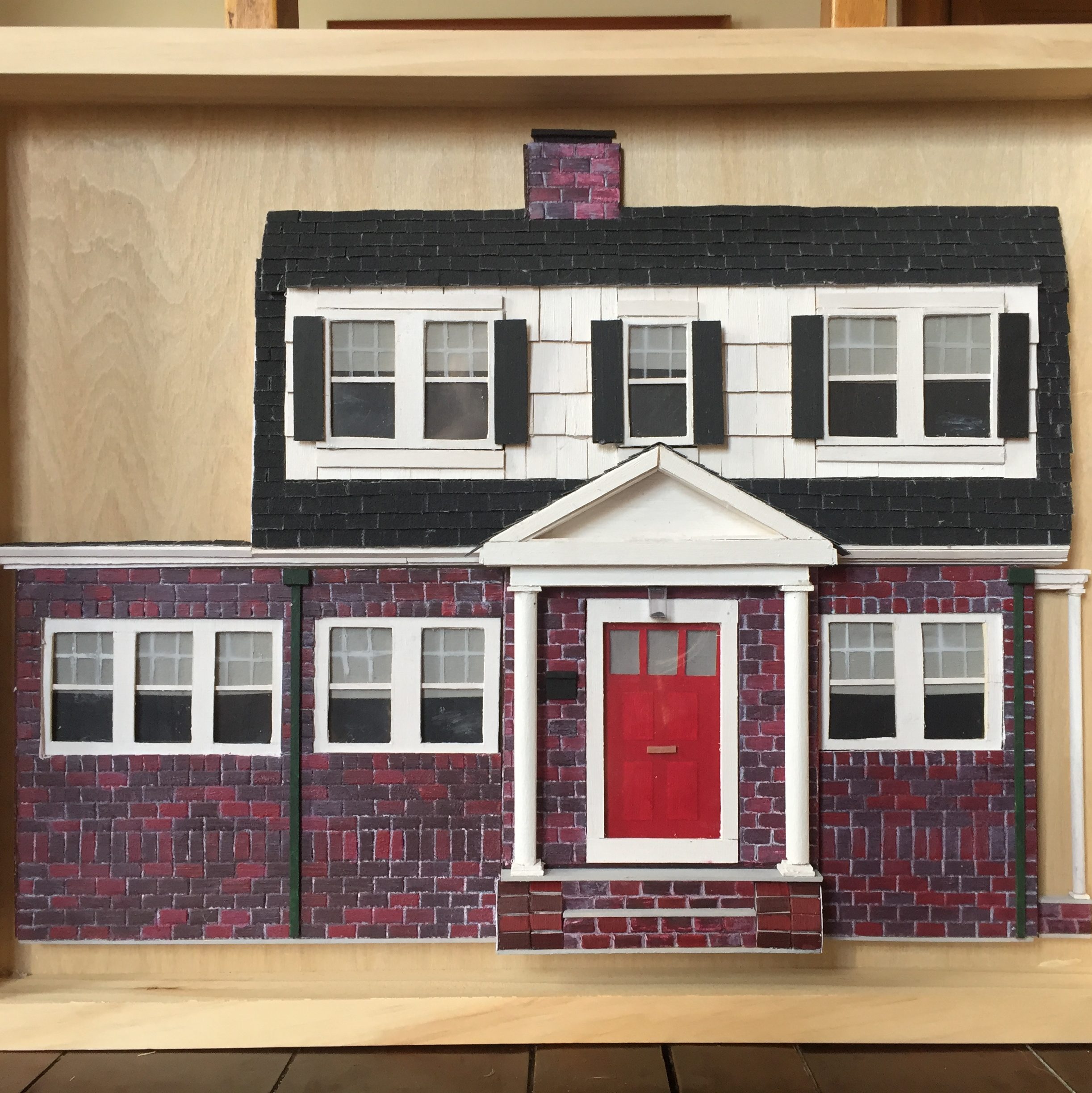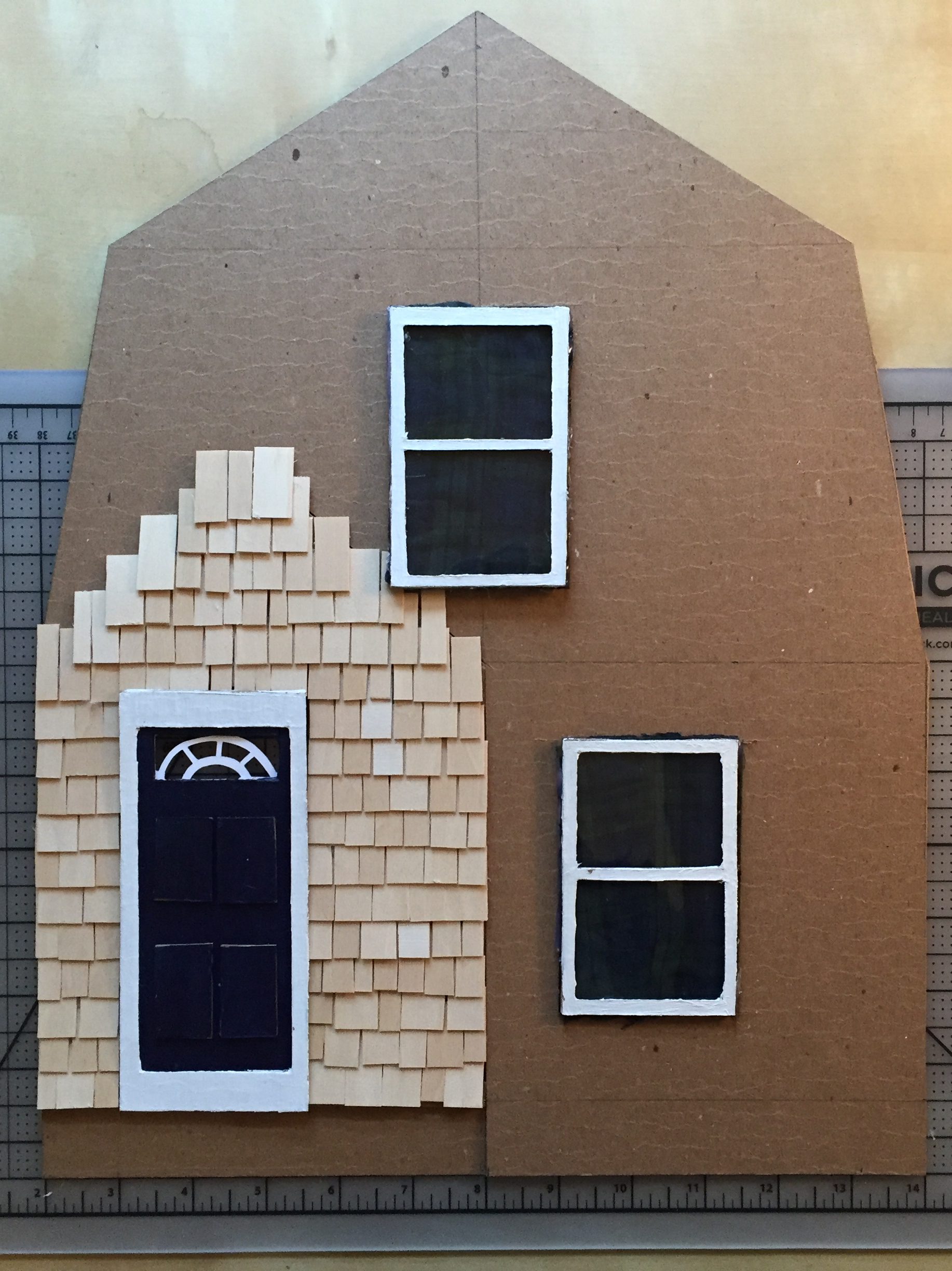 Every component is cut and glued individually: windows, doorframe, front steps. Then it’s wood shingles, vinyl siding, and brick.
